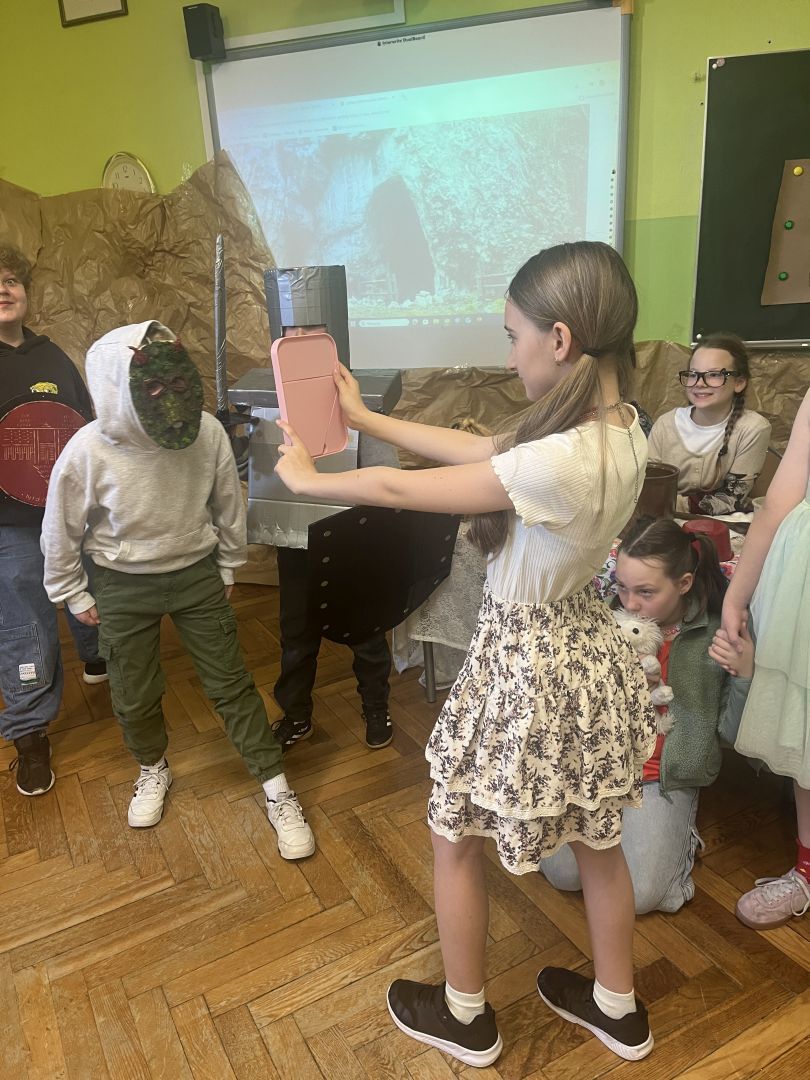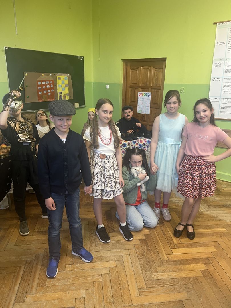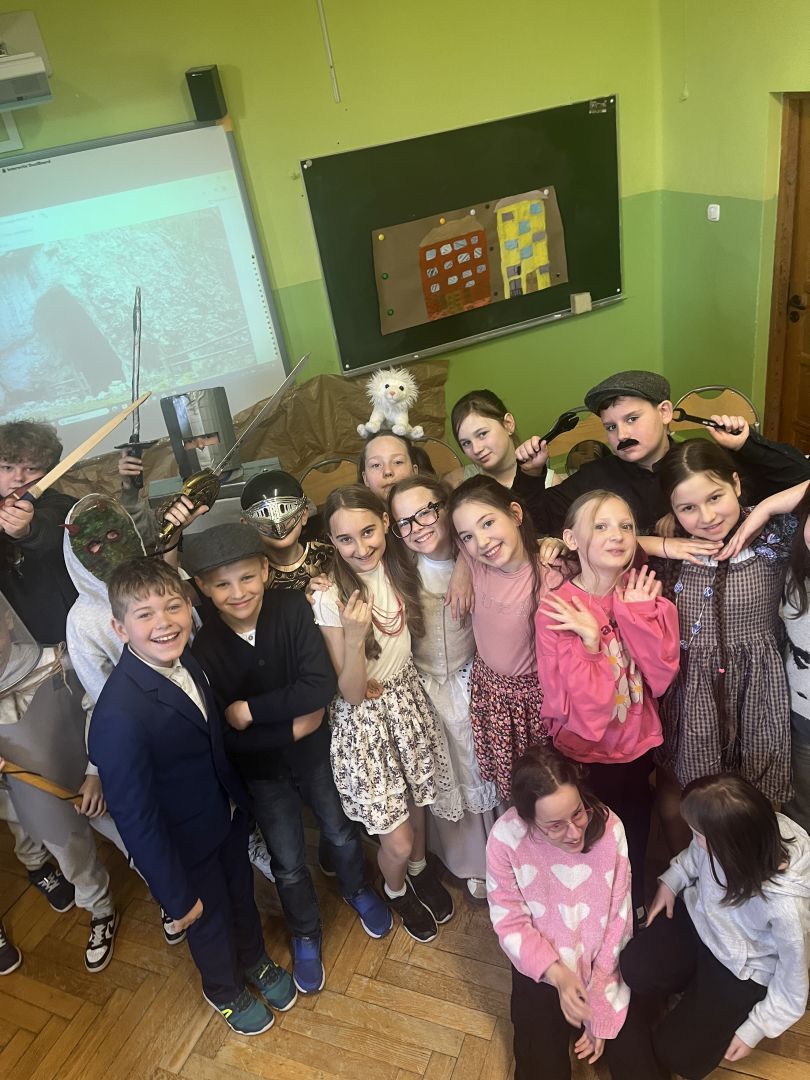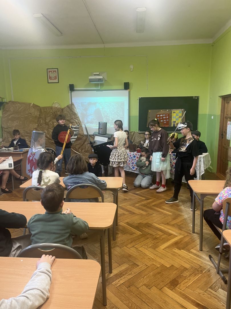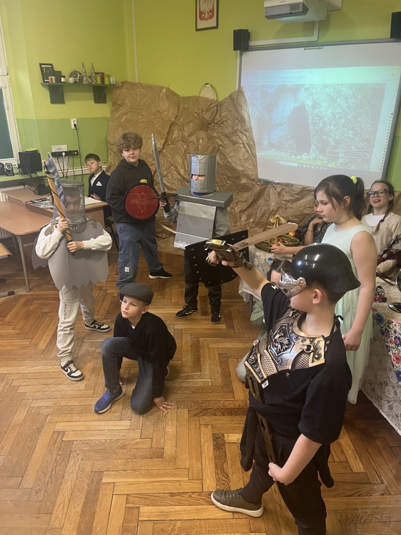 Klasa 4b przygotowała dla młodszych kolegów inscenizację „Legendy o warszawskim Bazyliszku”. Uczniowie z wielkim zaangażowaniem wcielili się w swoje role, przenosząc widzów w świat dawnej Warszawy.