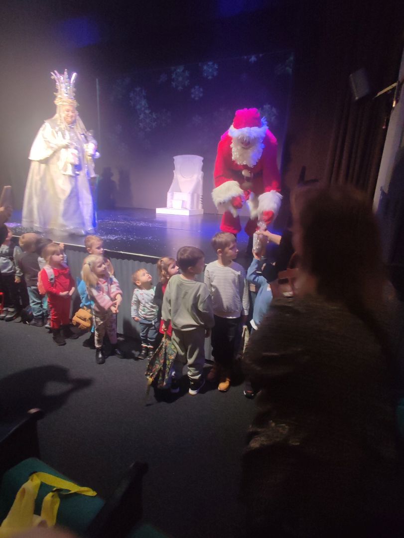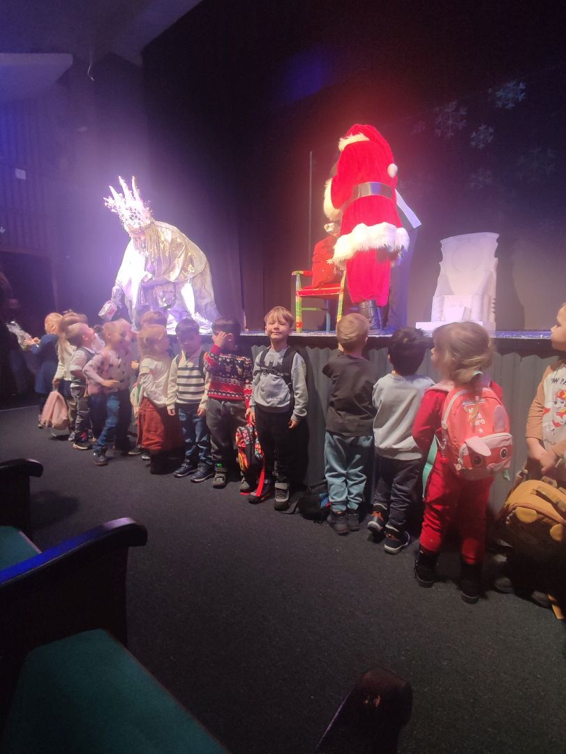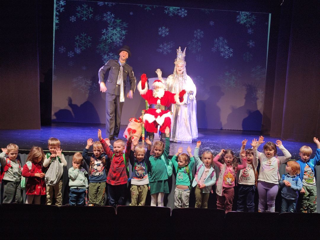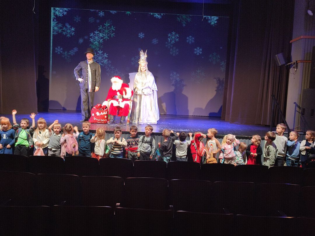 Oddziały przedszkolne naszej szkoły wzięły udział w wyjątkowym wydarzeniu kulturalnym – wyjeździe do Teatru Piccolo na bajkowe przedstawienie pt. „Bałwankowa Kraina cz. II”. Spektakl przeniósł dzieci do magicznego świata, w którym zła Żarżena próbowała odebrać zimie jej blask i radość. Na szczęście na scenie pojawili się odważni bohaterowie – dzielny pingwin oraz pełen humoru i energii bałwanek Jogi. Dzięki sprytowi, współpracy i wielkiemu sercu udało im się pokonać przeciwności i uratować Zimową Krainę. Dzieci z ogromnym zaciekawieniem śledziły losy bohaterów, żywo reagując na pełne humoru dialogi, muzykę i barwną scenografię. Po zakończonym spektaklu na najmłodszych czekała jeszcze jedna wyjątkowa niespodzianka. Przedszkolaki spotkały się z samym Świętym Mikołajem, który przywitał je serdecznym uśmiechem i wręczył każdemu piękne upominki. Radość i zachwyt na twarzach dzieci były najlepszym dowodem na to, jak wyjątkowy był to dzień.